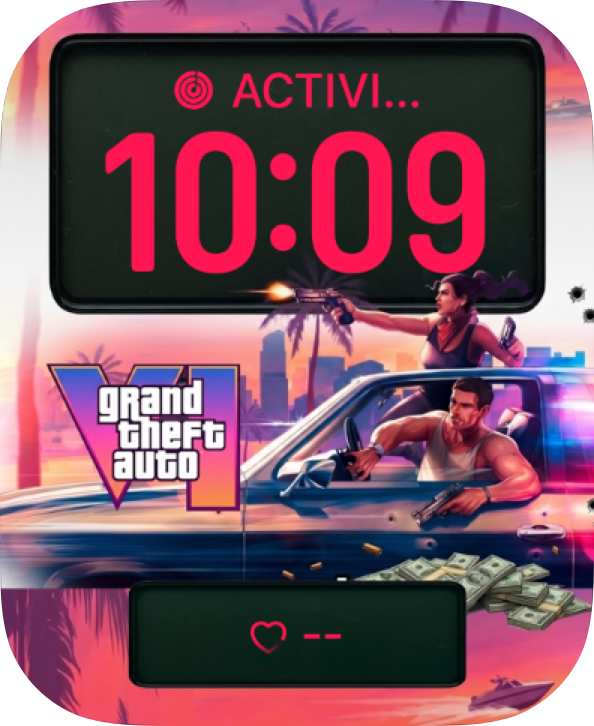 Bring Grand Theft Auto 6 style to your Apple Watch with neon cars, pastel streets, and a layout inspired by Vice City-era crime-game energy.