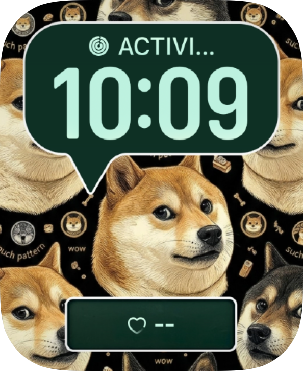 Cover your Apple Watch in Doge meme charm with repeated Shiba faces, tiny icons, and a playful dark pattern.