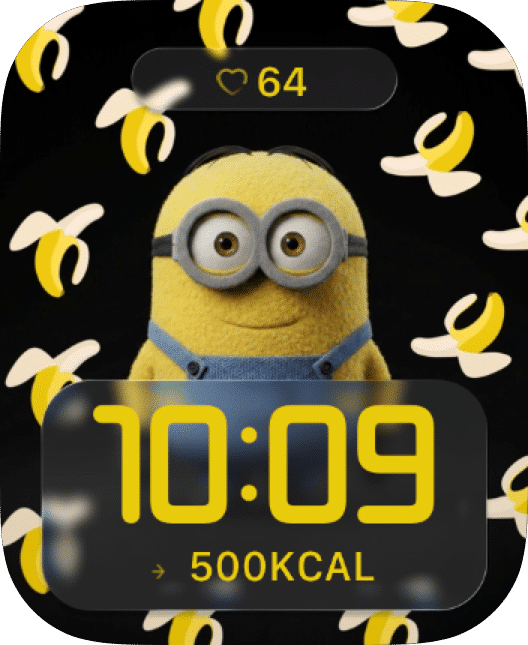 The Banana Minion watch face brings a playful cartoon look to your wrist with the iconic yellow character, floating banana pattern, and bold digital time 🍌💛✨ The layout stays simple and fun while keeping the clock large and easy to read.