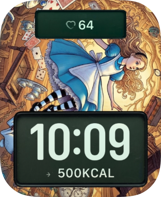 Alice Clockwork Dream watch face brings storybook magic, clockwork details, and whimsical Wonderland atmosphere to your Apple Watch. The bold layout keeps the time readable while the artwork gives your everyday setup a distinctive custom look.