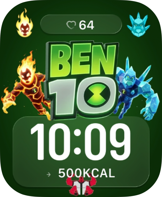 Ben 10 Element Force watch face brings bold logo art, elemental icons, and bright heroic color to your Apple Watch. The bold layout keeps the time readable while the artwork gives your everyday setup a distinctive custom look.
