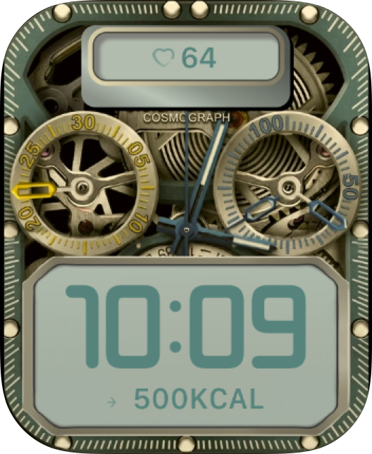 Cosmic Graph Mechanica watch face brings exposed wheels, instrument styling, and refined vintage mechanical detail to your Apple Watch. The bold layout keeps the time readable while the artwork gives your everyday setup a distinctive custom look.