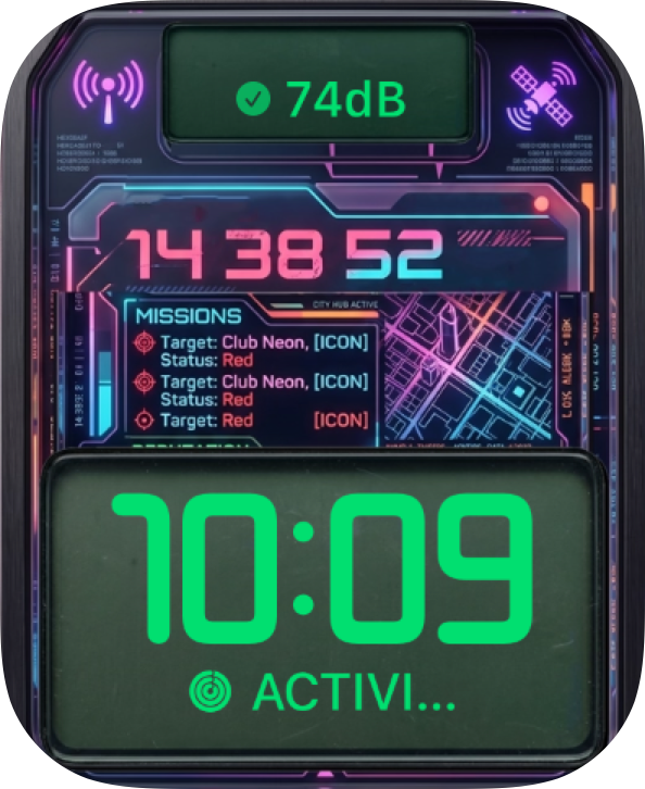 Load your Apple Watch with a cyberpunk control panel featuring neon coordinates, mission notes, and a futuristic street-tech vibe. 🌆📡💜 Cyberpunk Mission Grid feels like a sci-fi HUD pulled from a late-night megacity run.