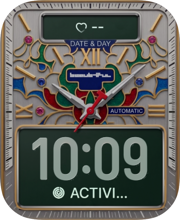 Dress your Apple Watch in ornate mechanical detail with a date-and-day layout, colorful mosaic accents, and polished gold trim. 🧩⌚✨ Mosaic Day Date feels decorative, classic, and premium.