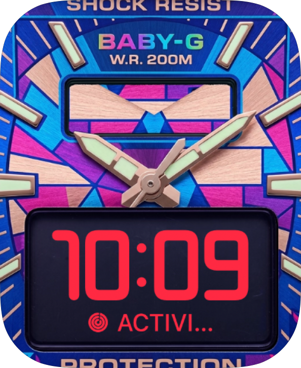 Bring bold Baby-G sport style to your Apple Watch with shock-resist lettering, bright blue geometry, and a punchy red digital display. π΄βπ₯ Shock Resist Baby-G is energetic and rugged.
