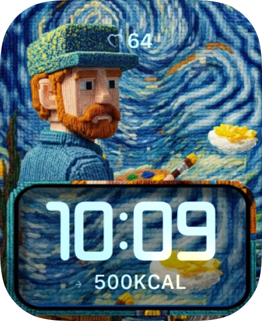The Starry Stitch watch face turns a classic painterly scene into a cozy textured design 🧶🌌 The stitched portrait, swirling blue sky, and rich handcrafted details give it a warm artistic feel. A transparent time panel keeps the layout readable without covering the artwork too heavily. 🎨✨