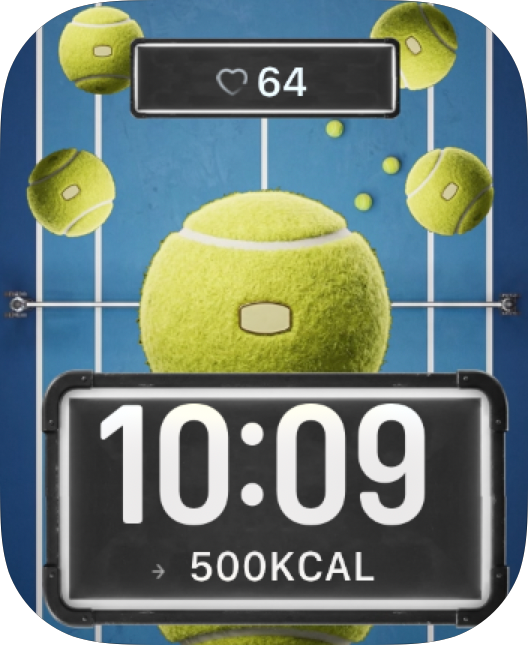 Tennis Court Bounce watch face brings giant tennis balls, court lines, and punchy athletic contrast to your Apple Watch. The bold layout keeps the time readable while the artwork gives your everyday setup a distinctive custom look.