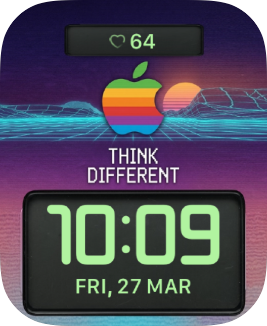 Bring retro-futuristic Apple energy to your Apple Watch with a neon grid sunset, rainbow icon, and bold Think Different mood. 🌅🌈✨ Think Different Sunset feels nostalgic, vibrant, and unmistakably retro.